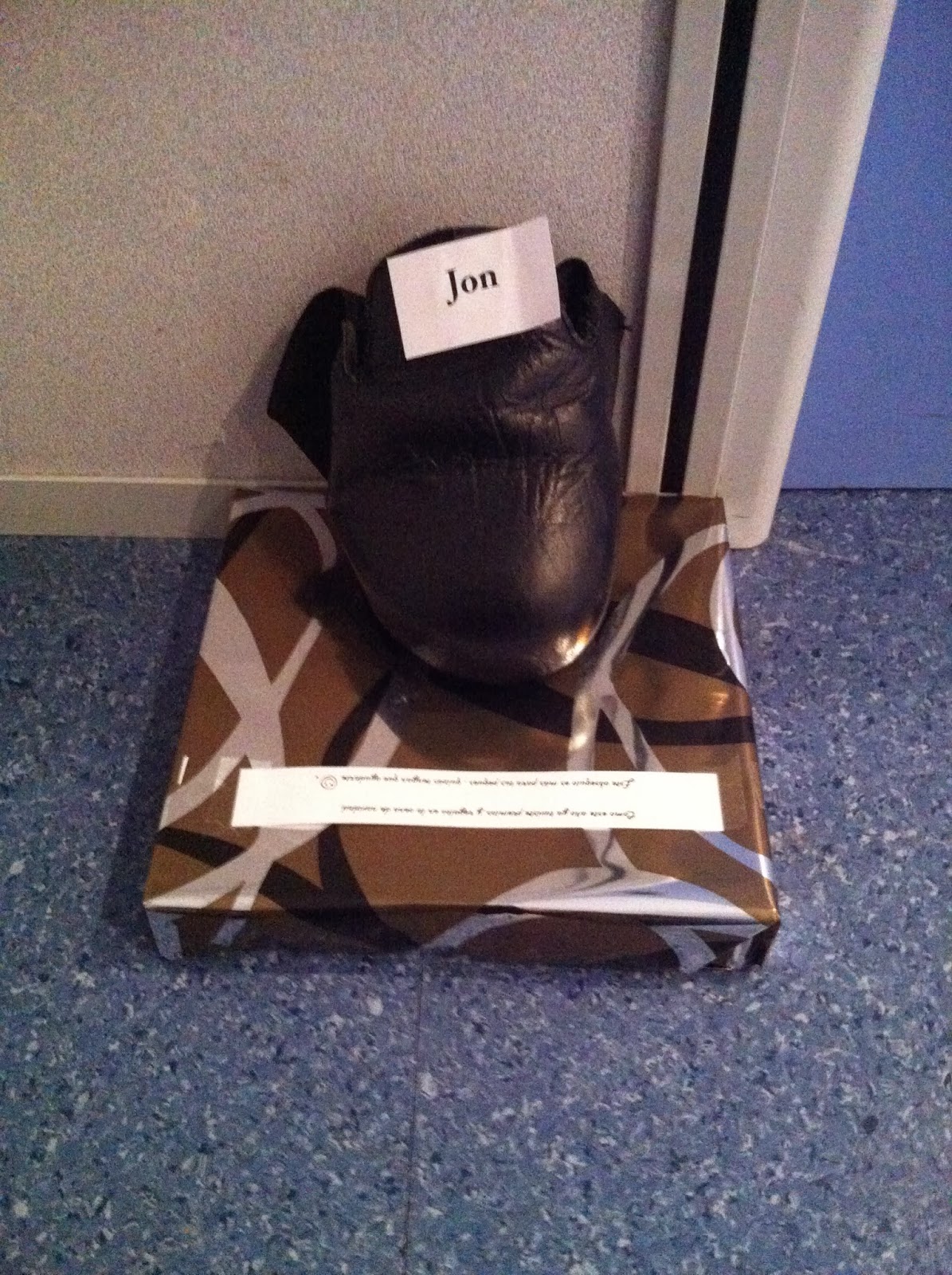 El año pasado, empezamos a trabajar el 8 de enero, y se me había olvidado completamente lo del año pasado, pero allí volvía a tener apoyado en mi puerta un regalo, un mensaje y una calza de producción.